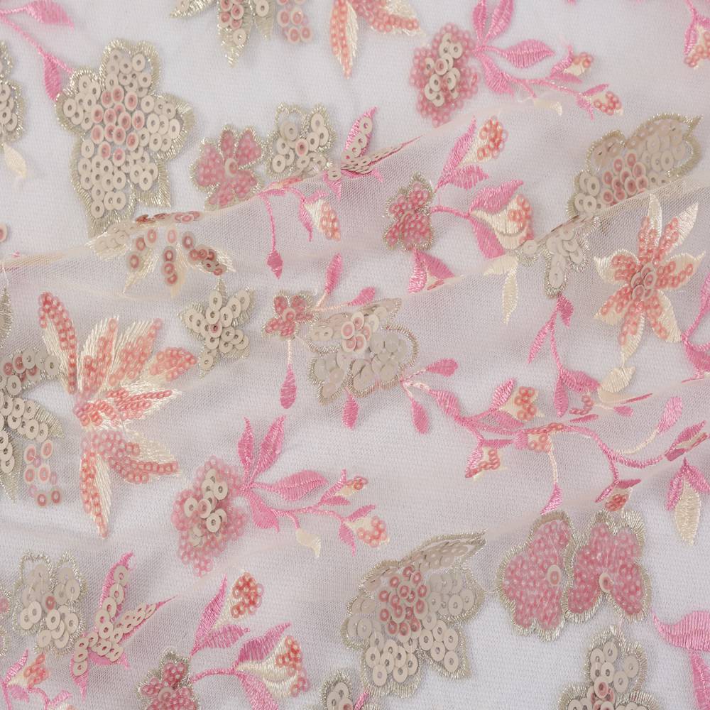 Mesh fabric with pink sequins and embroidered patterns
